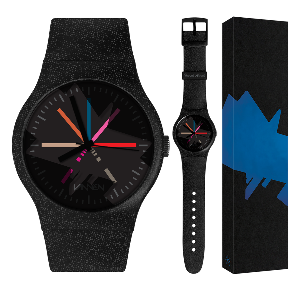 The new, special edition Touché Amoré x Vannen watch is limited to 150 pieces and is ON SALE NOW at VannenWatches.com and Store.ToucheAmore.com for $65. Each watch features silkscreen art on the straps, casing, dial, and crystal. Each watch also comes packaged in a custom matte black sleeve adorned with metallic blue foil. As a bonus, select orders will be chosen at random to receive autographed packaging signed by the band. Good luck!