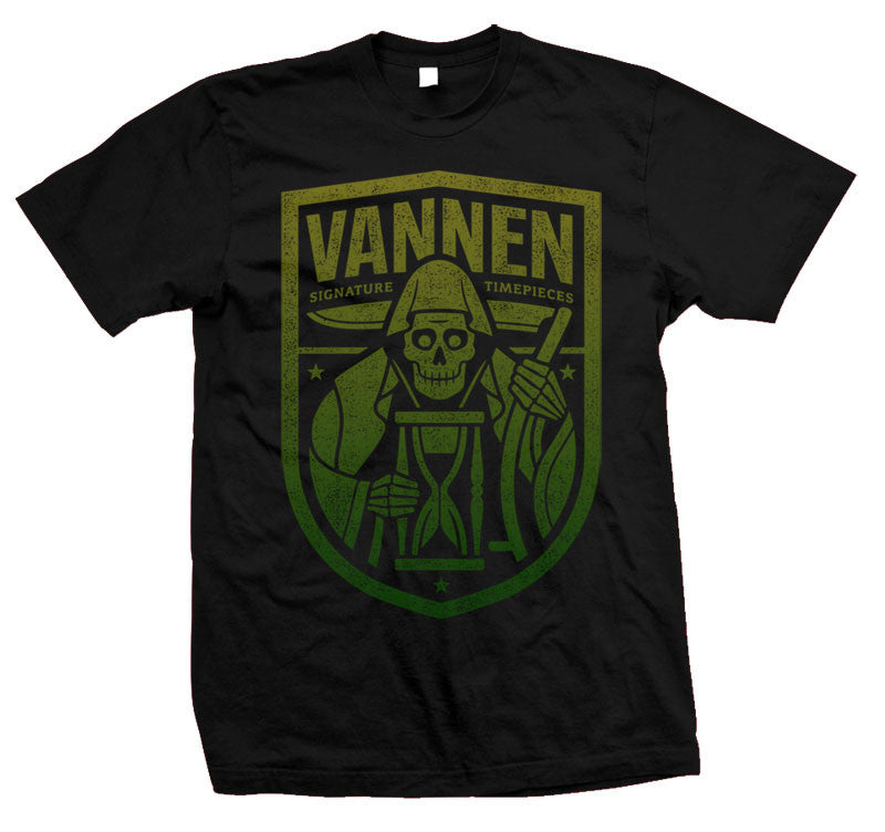 Limited edition "Toxic Reaper" Vannen t-shirt. Printed on super-soft, black poly-cotton (50% polyester / 50% cotton) fabric for a great unisex fit that feels like you've owned the shirt for years. If you are currently between sizes; we recommend that you order the next size up.