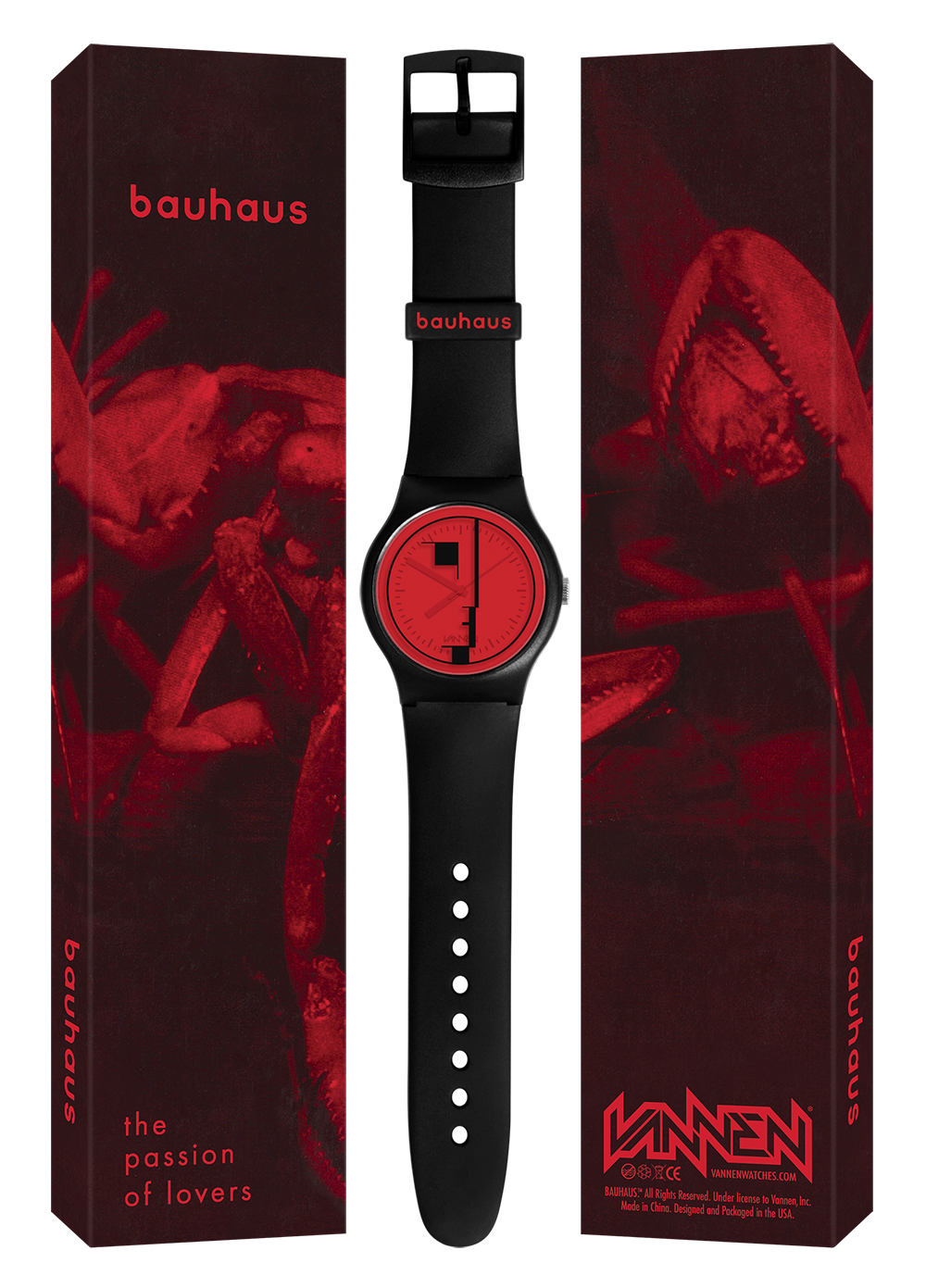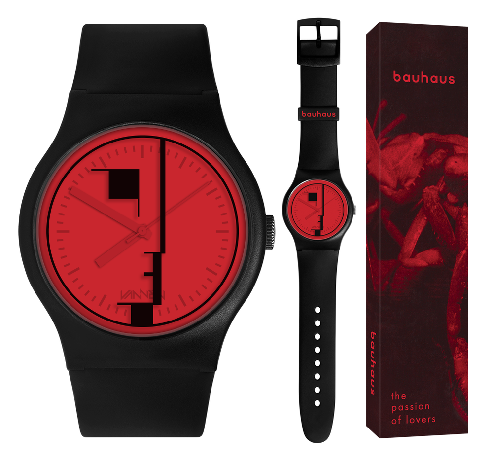 The new Bauhaus "The Passion of Lovers" 40th Anniversary Vannen watch is limited to 200 pieces and features a red-tinted crystal with a black Bauhaus logo printed on the inside surface of the crystal. Each watch also comes packaged in a custom "The Passion of Lovers" sleeve.