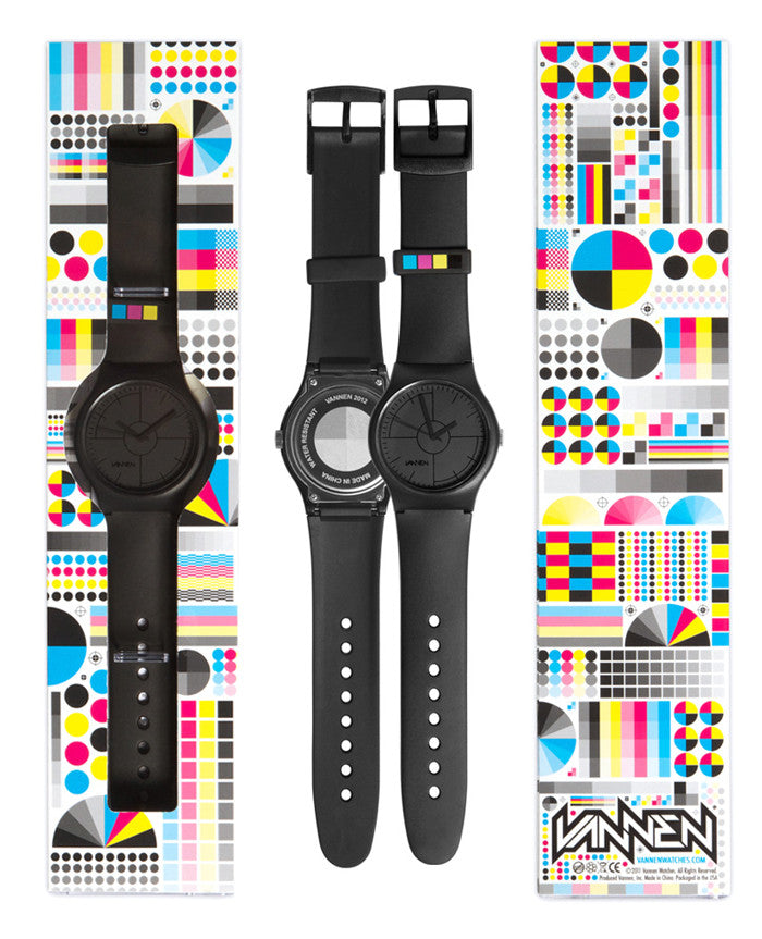 The CMYK series from Vannen is an appreciative nod to printmakers and graphic designers. This classic matte black watch features a unique dial design that mixes traditional index markings with printers registration marks, giving it the simplicity to be worn with anything and the detail to be appreciated up close.
