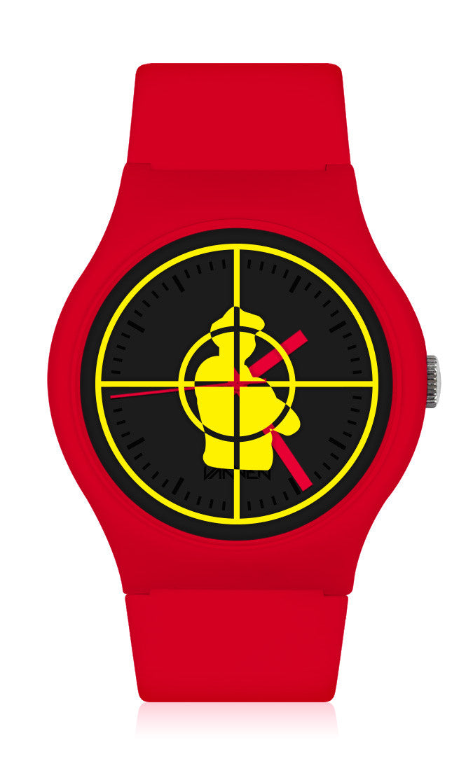 Limited edition Public Enemy "Red Alert" Vannen Artist Watch. Only 150 pieces available. Each Red Alert watch comes packaged in a custom Public Enemy sleeve.