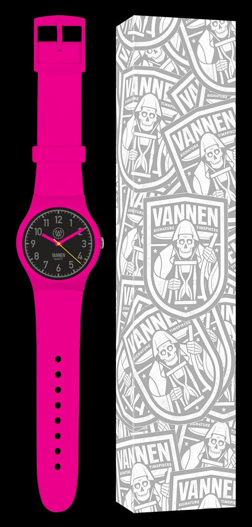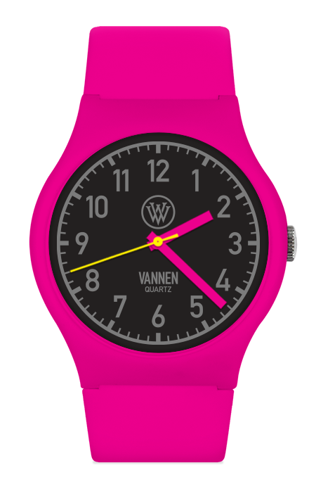 Movement: 3-Hand Japanese Quartz. Buckle & Loop: Plastic, Matte Pink.