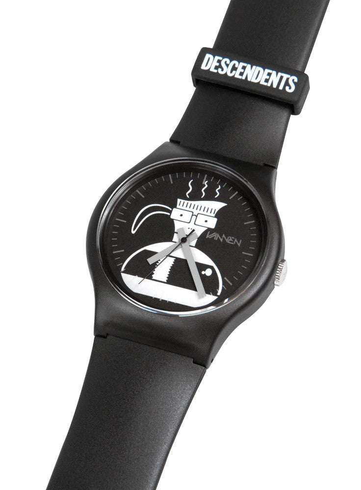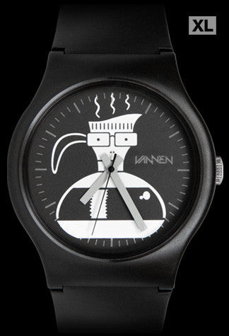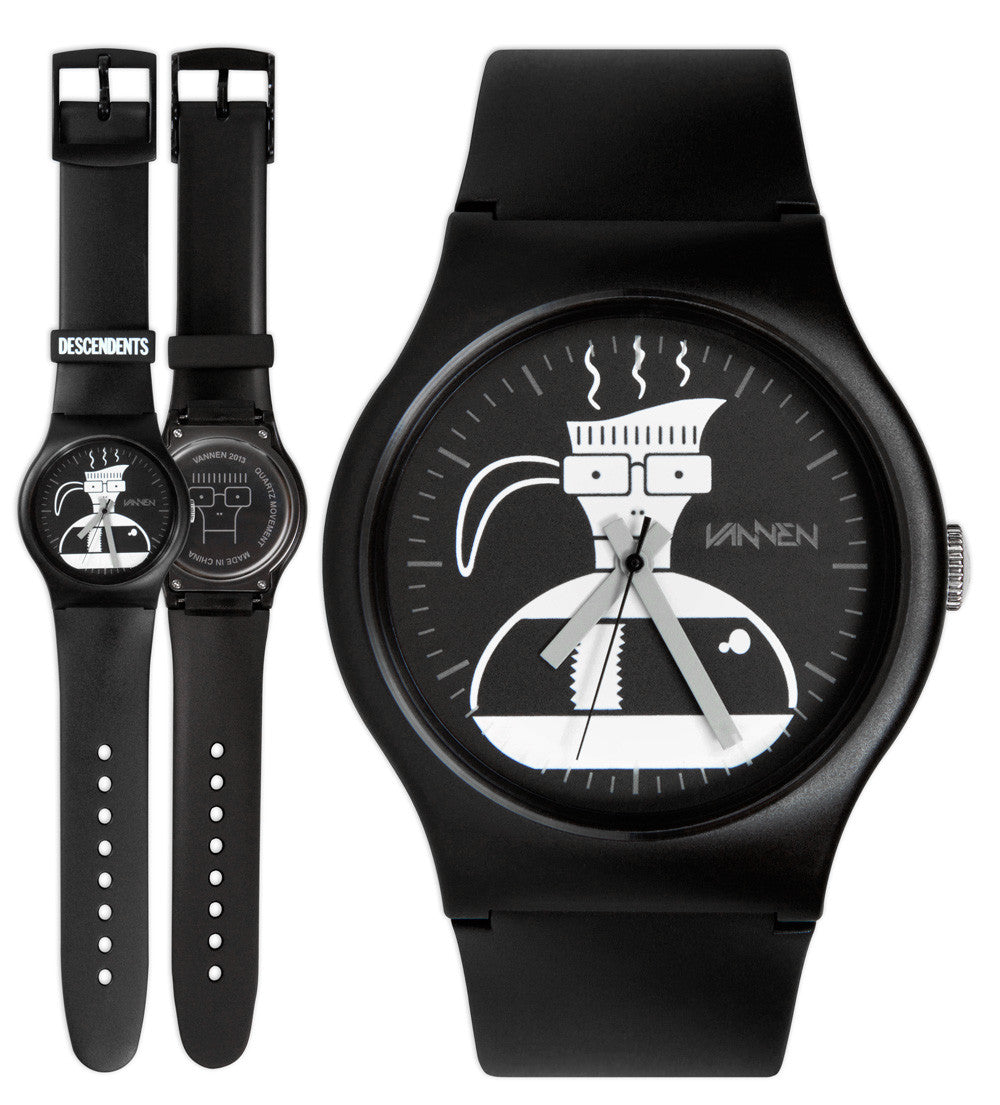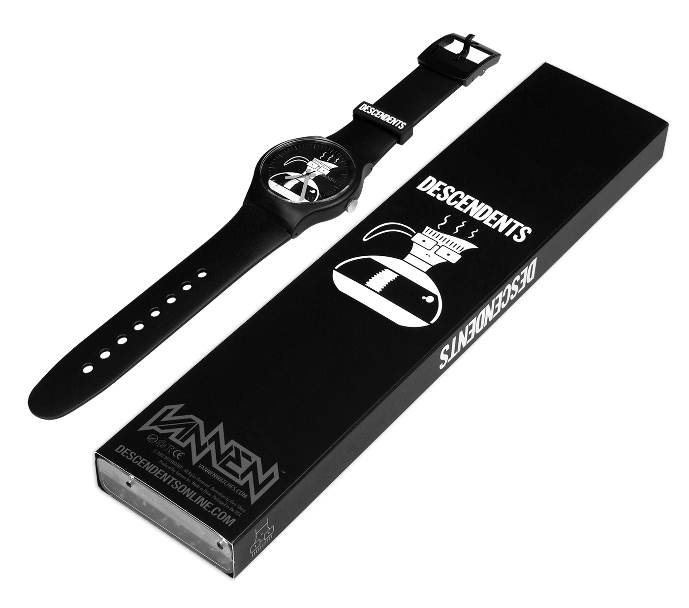 The limited edition Descendents 'Coffee Time' Vannen Artist Watch features a glossy white Milo coffee pot on a matte black dial with subtle Index Markings printed on the inside surface of the crystal giving this minimal design some serious pop!