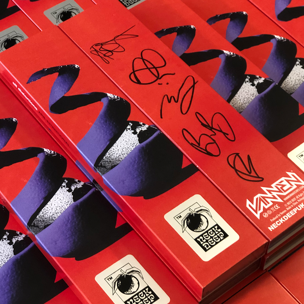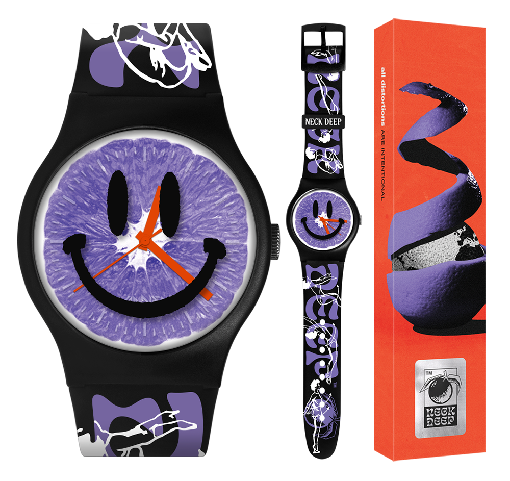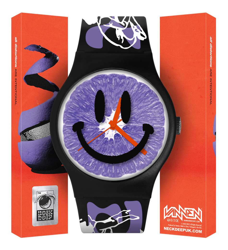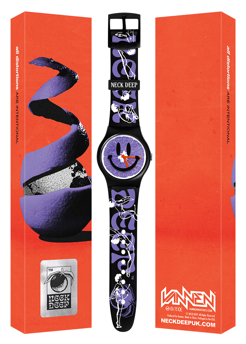 The new, limited edition Neck Deep x Vannen watch features purple and white silkscreen art on matte black straps, and a glossy black smiley face printed on the inside surface of the crystal. Each watch also comes packaged in a custom Neck Deep sleeve. As a bonus, select orders will be chosen at random to receive autographed packaging signed by the band. Good luck!