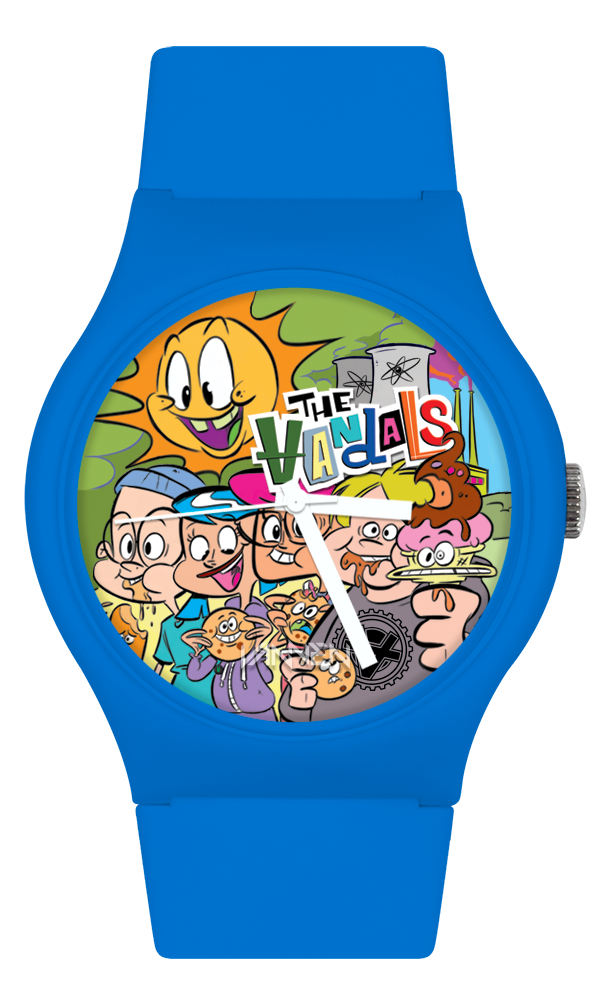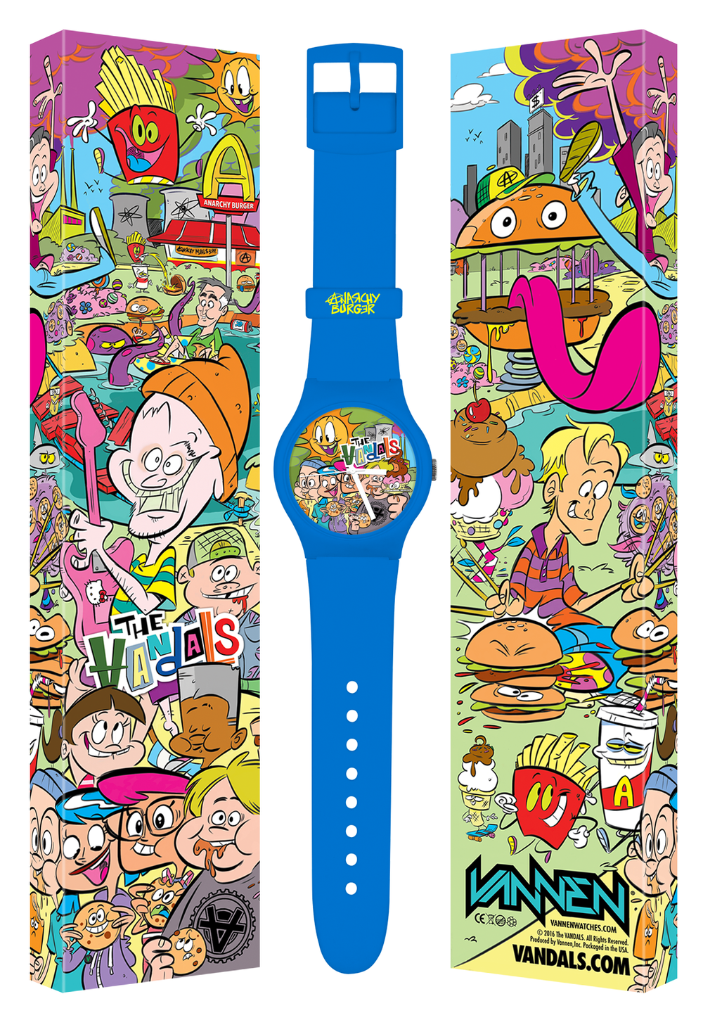 The Vandals new, blue "Anarchy Burger" watch is limited to 50 pieces and features artwork by Cory Toomey. Each watch comes with custom Vandals etchings on the back casing and crown, full-color art, and hilarious packaging inspired by the Vandals song “Anarchy Burger.”